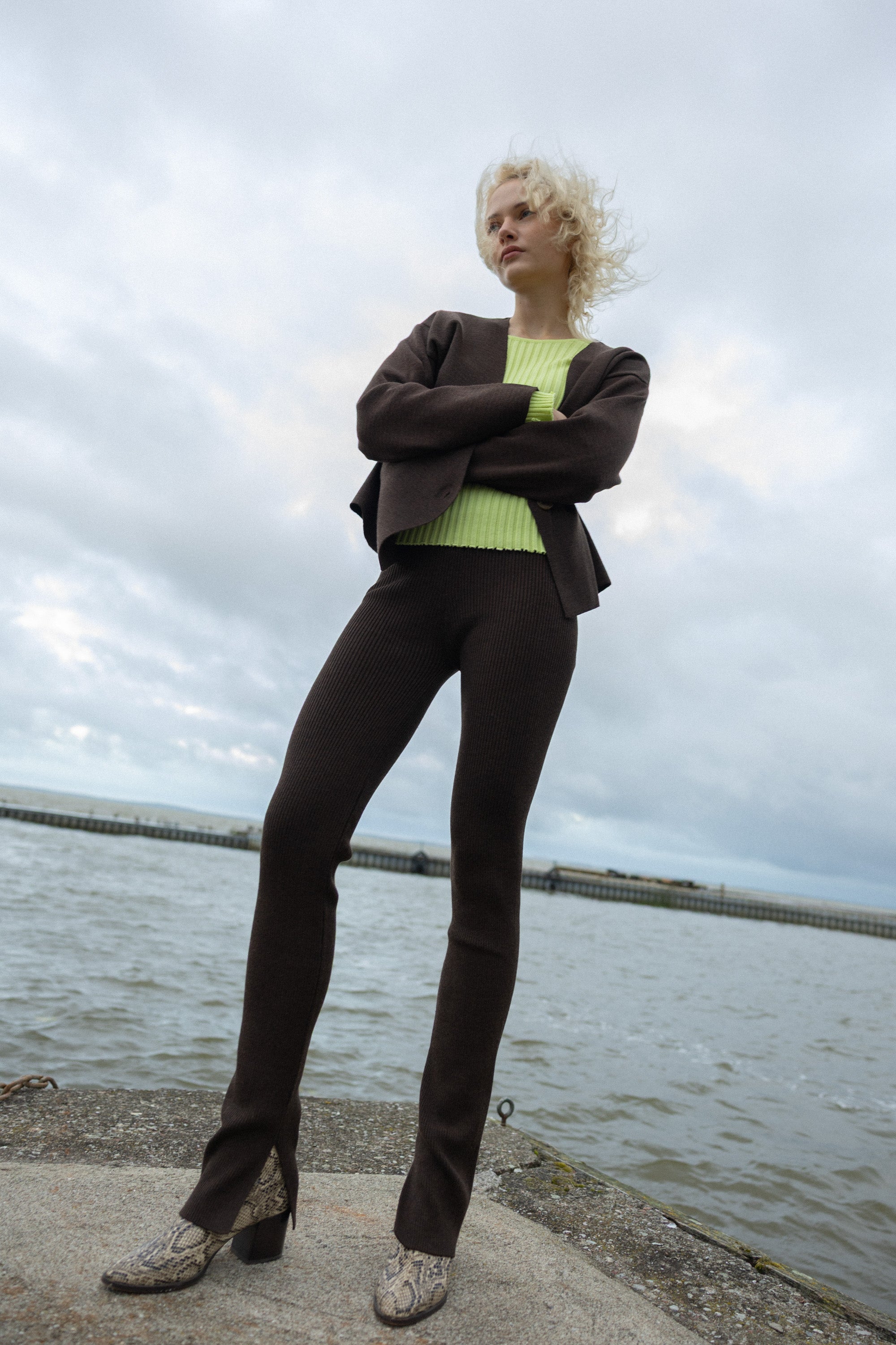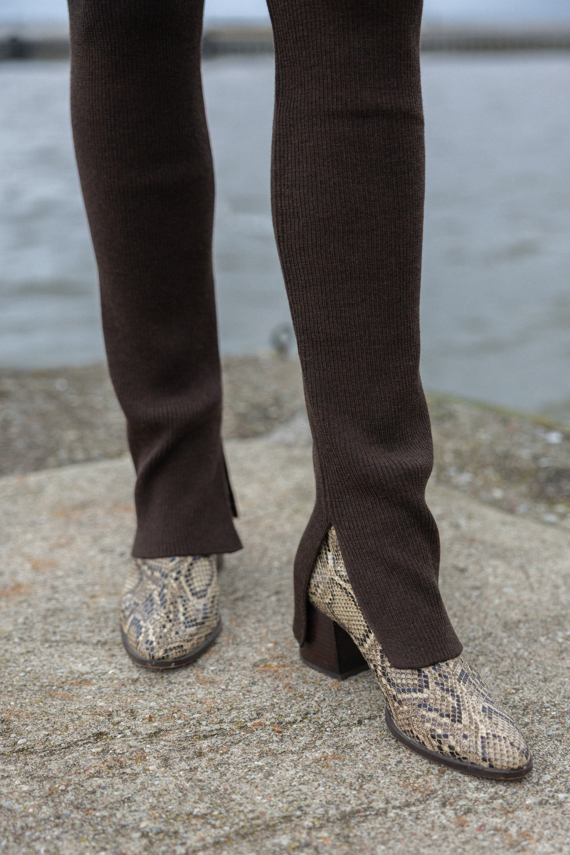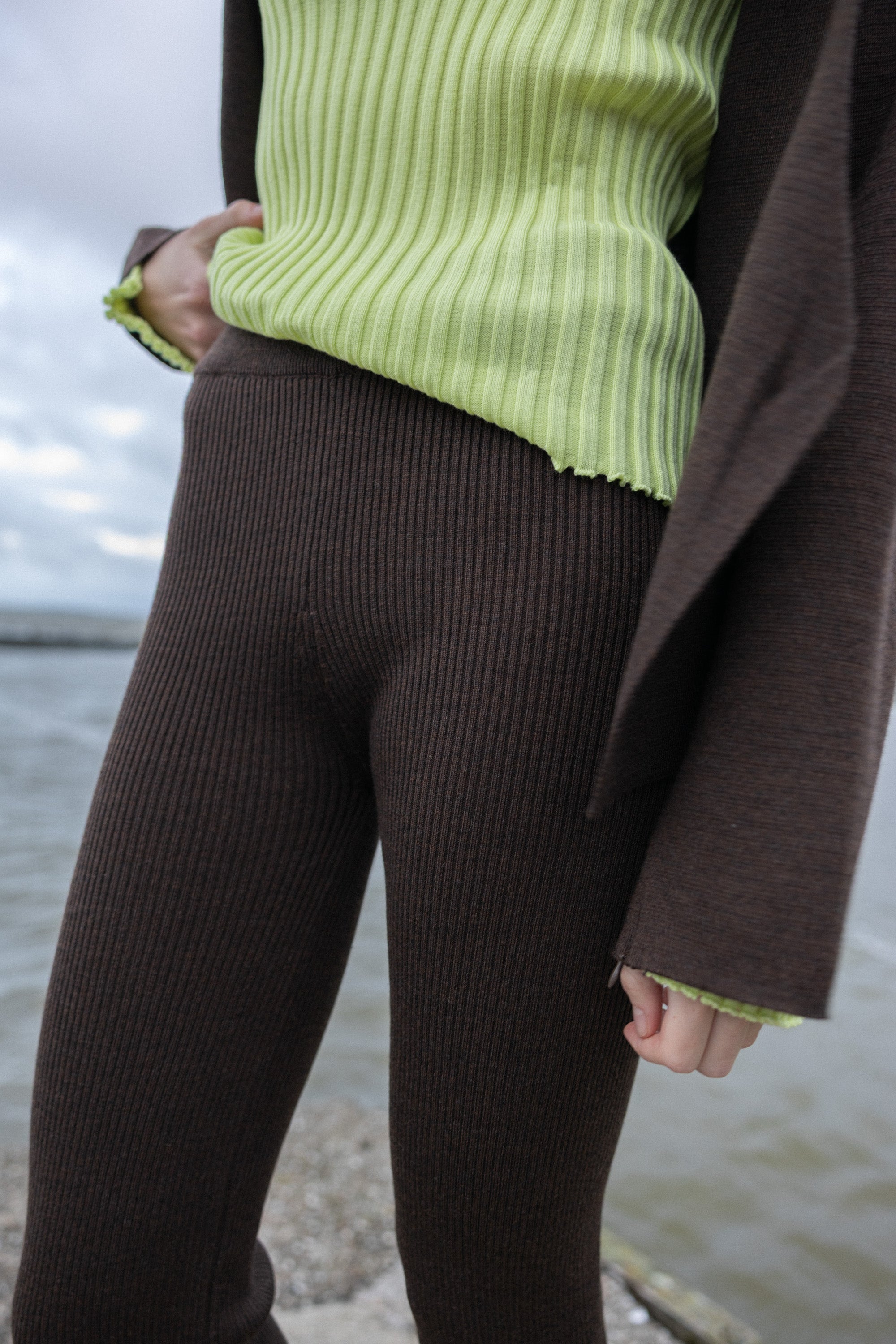 They are rib-knitted in a slip-on style with split hems. These leggings sit on the waist with an adjustable elastic band, ensuring a personalized fit. Yes, just like in children's clothes! It worked great for our clients. We tried them on a bunch of our friends with different body shapes and sizes - they all agreed the fit was just perfect to adapt even during pregnancy! Wear them paired with your favorite shirts, blazers, or oversized sweaters.